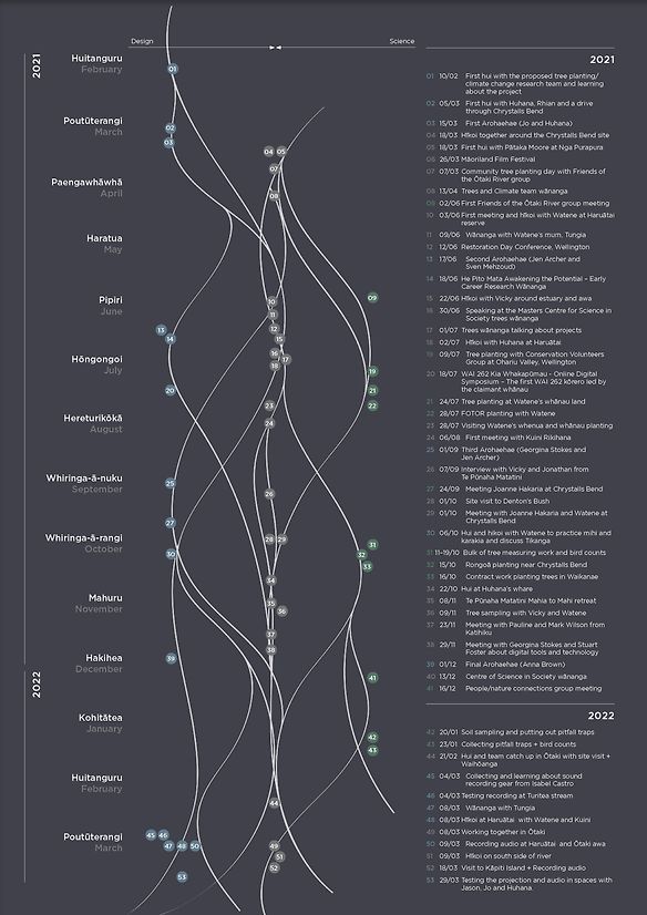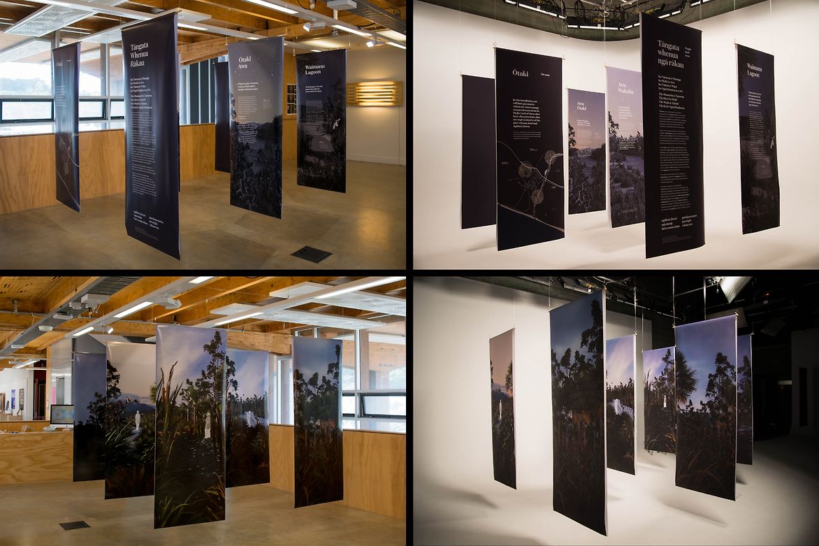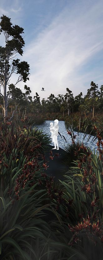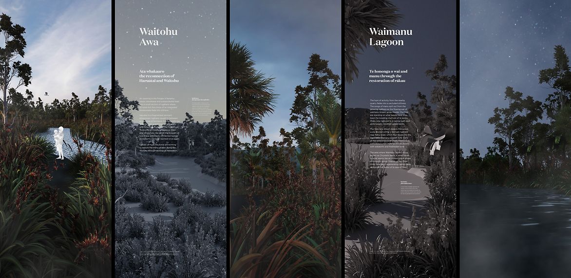 Guided by the overarching principle of whakapapa we acknowledge that this relationship extends beyond rākau to the pre-colonial whenua, dominant with puna wai Māori (freshwater systems) and kōreporepo ngāhere (swamp forest). Out of the process of centering whanaungatanga, hīkoi and kōrero of past and future visions arose the spatial design themes of 3D visualisation, immersion and experience. These forms have come together through an installation that will guide people through an immersive visual karakia that expresses whakapapa and mauri, preceding a series of visualisations that represent three familiar sites within Ōtaki that connect wai and rākau. The purpose is to evoke people to whakarongo (listen and feel) and kōrero (discuss).