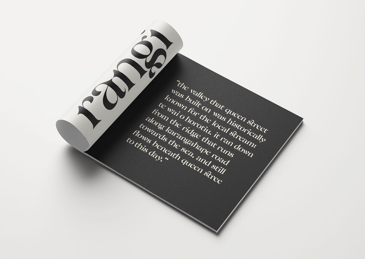 Creating a successful typeface involves looking at how designed letterforms work coherently as a group. The fundamental construction of the typeface is based on the abstract form of Wai Horotiu stream. Successfully developing this has required many trials and errors, with each letter undergoing many refinements to develop rhythm and flow.