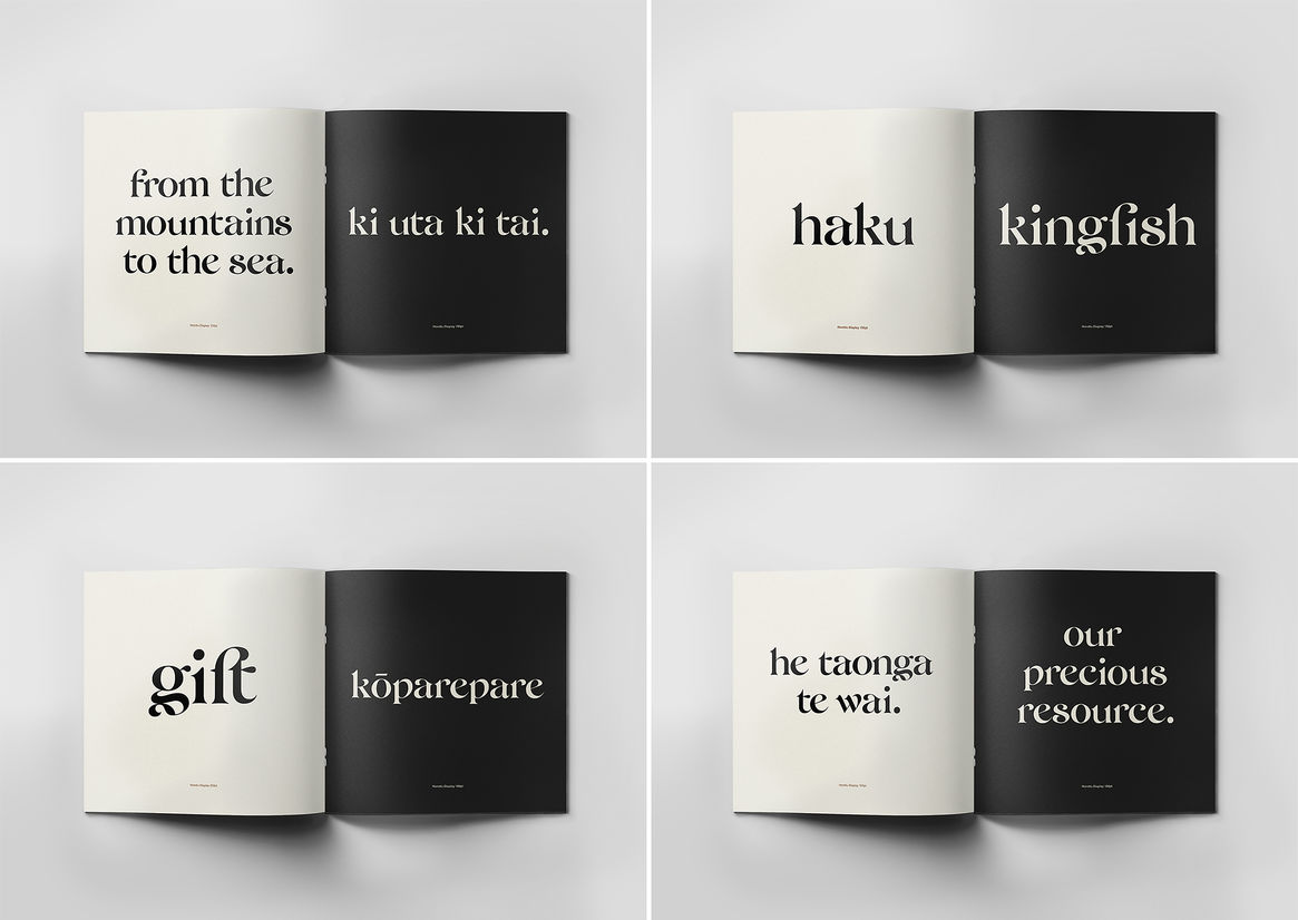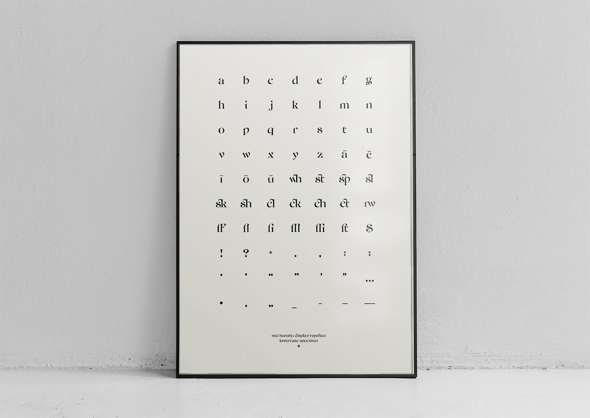 Wai Horotiu is a high-contrast serif typeface with a signature wave-flowing movement inspired by the way Te Wai Horotiu stream flows. The letterforms capture the natural movement, embodying a rhythmic cadence that mimics the water's course, while the pronounced strokes and the masculine constructions of the display typeface are evocative of the taniwha Horotiu.
