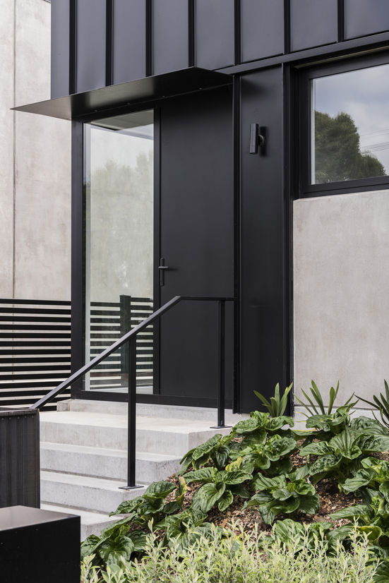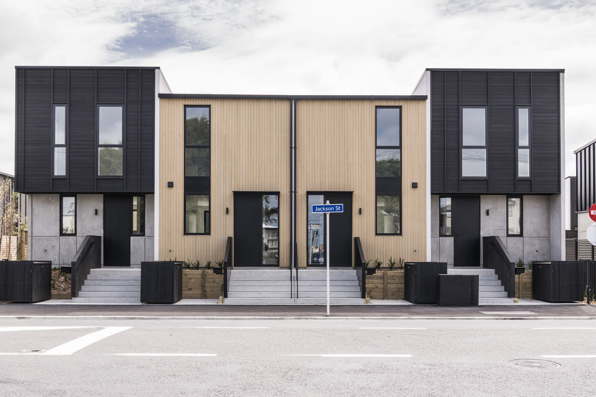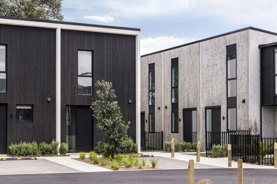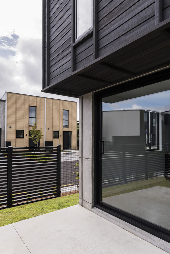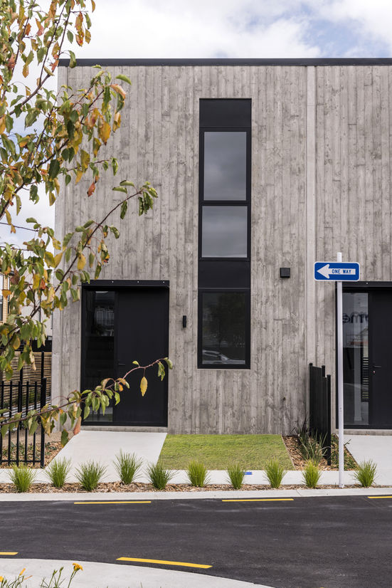 The overall development is planned and articulated in a manner that provides a sense of individuality and physical land ownership to each dwelling. A muted material palette of thermally modified New Zealand Pine, embossed concrete and steel tray claddings speak to both the cultural and industrial narratives of the Petone community.