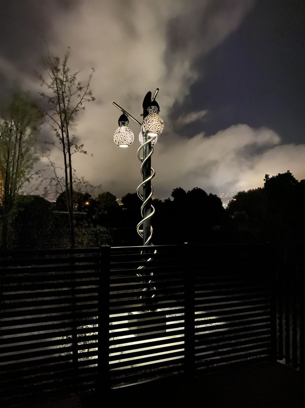 The artwork on the sign that faces Jackson Street represents Te Marama, which translates as the moon. The sand blasted pathway pattern represents He Whariki o Nga Whetu, translated as the mat of stars most commonly known as the Milky Way. Te Marama gifted the whariki to Rona, whom he fell in love with after taking her from earth when she cursed him for not allowing enough light for her to see when fetching water with her hue translated as calabashes. This is the final sculptural art piece, which represents the calabashes of Rona and how they grow on vines, which connect to He Whariki o Nga Whetu. The use of light represents the light of the moon and the light of the stars to uphold the mana of Paetutu as a place, forever lamenting the name of Paetutu back into the urban realm as a living contemporary Kainga.