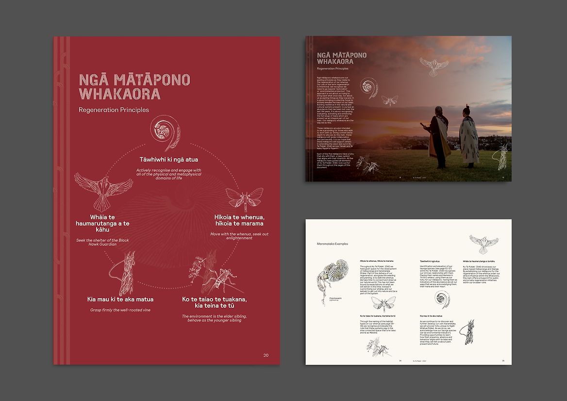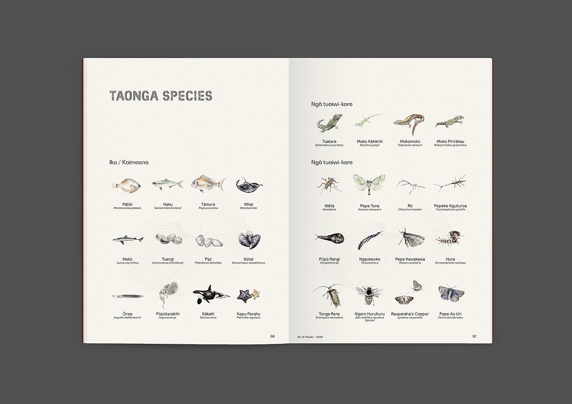 This entry explores a graphic design and drawing process to create a publication of meaning, beauty and depth. KTP:2040 provides an access point for uri (descendants), the local community, local government and environmental stakeholders, inviting all audiences to understand the broader kaupapa of the project, and a window into the status of regeneration work on the ground. It is a strong statement of whakapapa and belonging, of a people being native and natural in their place.