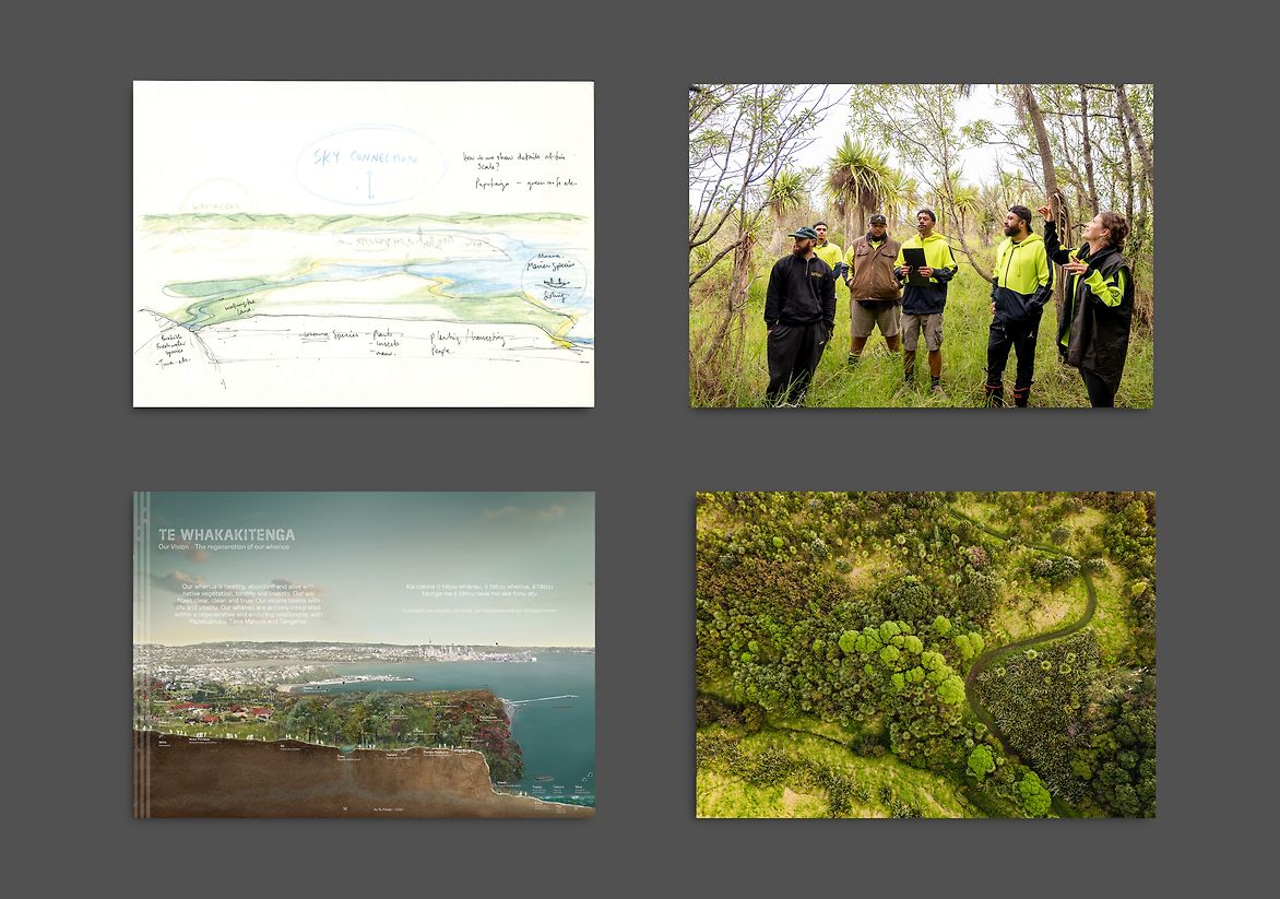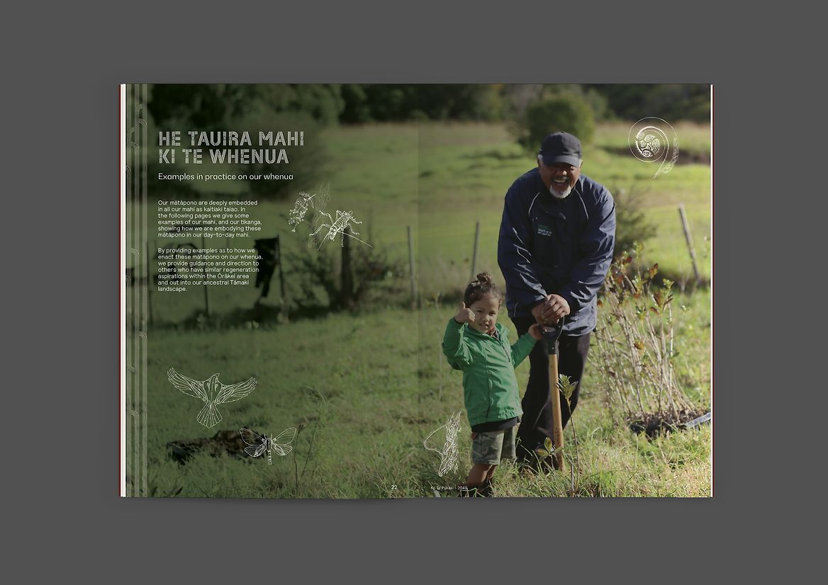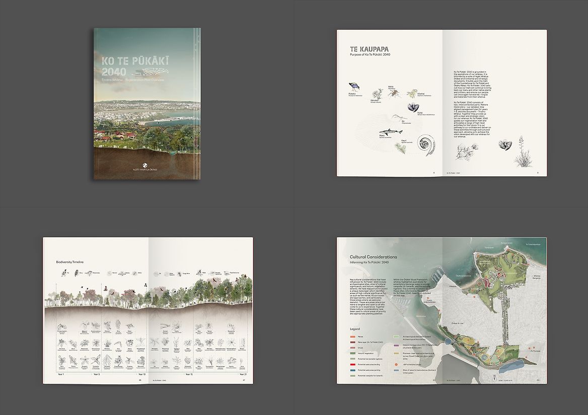 The strong collaboration between the designers and Ngāti Whātua Ōrākei imparted a sound landscape-based knowledge, and a unique graphic character and beauty that carries the intent and aspirations of the tribe. A direct objective of the tribe was that the publication speaks directly of and to the whenua itself.