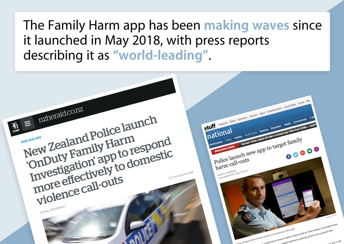This project sat at the heart of an important area of work for the Police - the prevention of family violence. Domestic violence accounts for 40% of front line police time (around 330 incidents a day), officers had a 13 page form to fill in for each visit. The designers put the needs of both the officers attending incidents and the victims at the centre of the design solution – victims were often unable to articulate themselves in front of others and the app enabled victim feedback with complete privacy confidence – which also promoted a ‘personal’ interaction with the officers. With the new app officers can spend more time investigating family harm incidents and less time on back office tasks, back at the station.