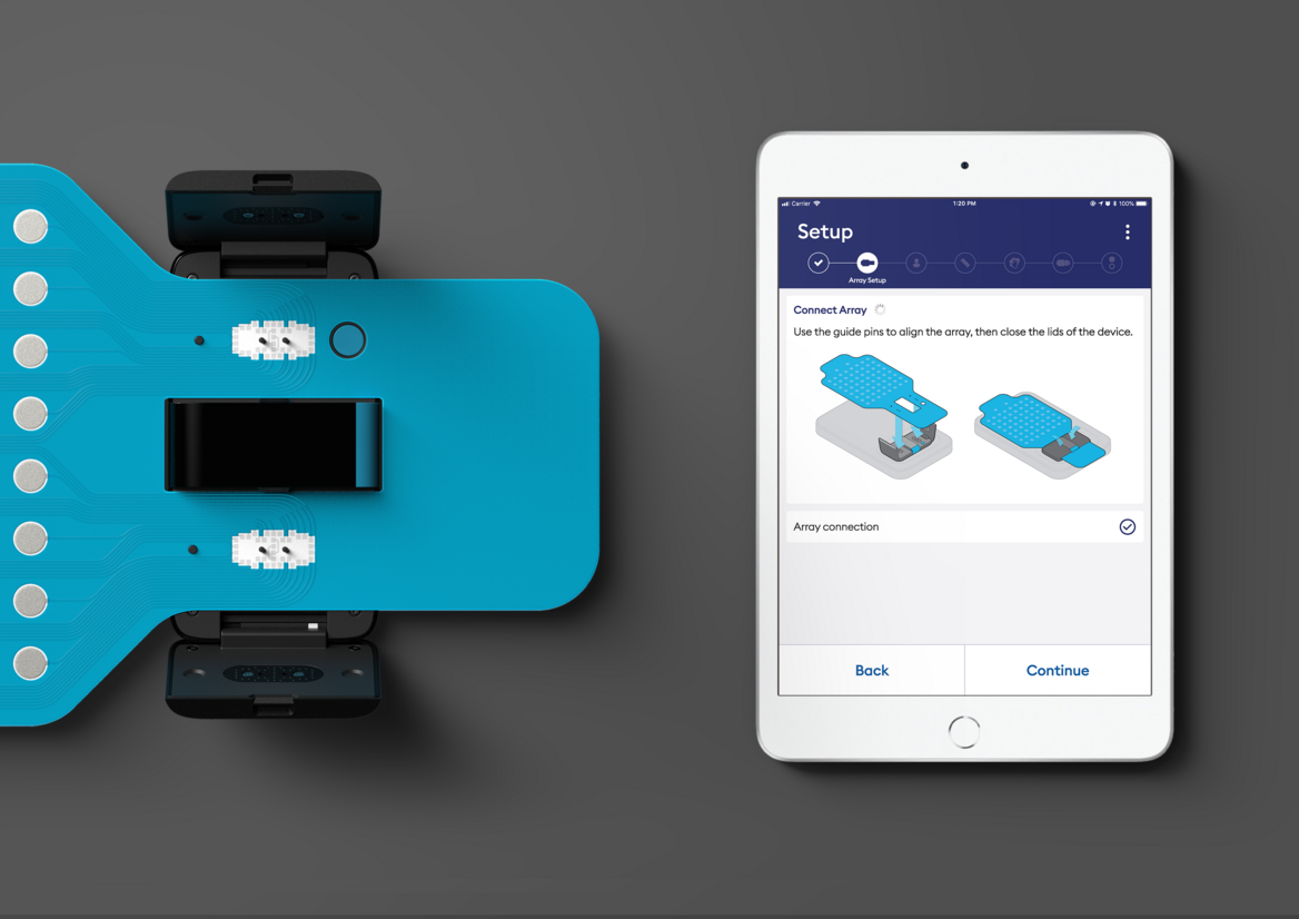 - The Array, a next generation hi-res 64 channel conformable electronic sensor patch, replaces dozens of cables and individual electrodes. We developed new tools to manufacture the array at scale, pushing screen-printed bioelectronics to the limit.