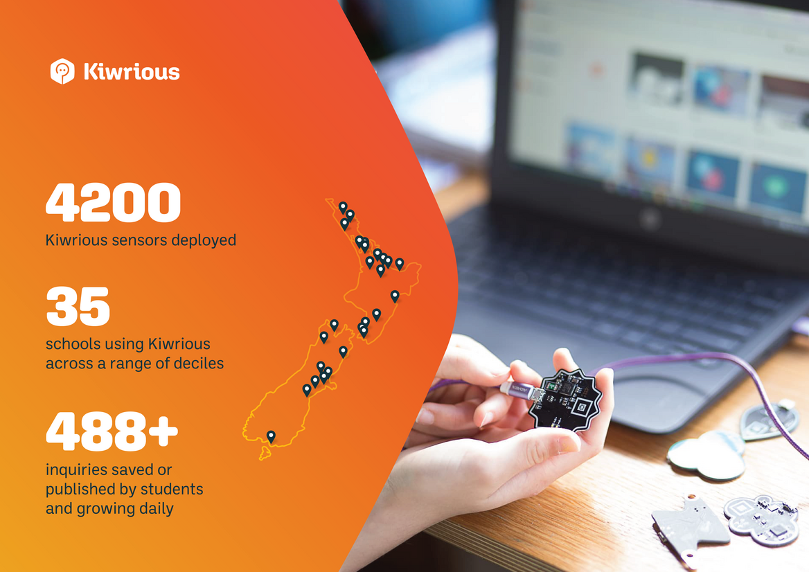 Over 4200 sensors deployed to 35 schools across New Zealand in just 18 months. Kiwrious transforms science, by promoting genuine curiosity through real-world exploration and engagement. Since it has been deployed, 488 inquiries have been saved or published by students and the number continues to grow daily.