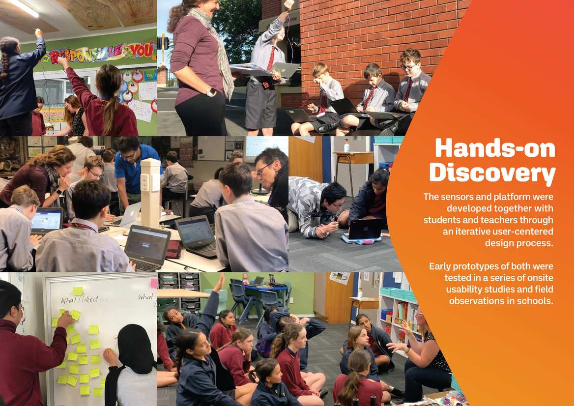 The sensors and platform were developed through an iterative user-centered design process. Early prototypes of both were tested in a series of onsite usability studies and field observations in schools, and a longer in-the-wild study where they were left with students to use as they pleased over the school holidays.