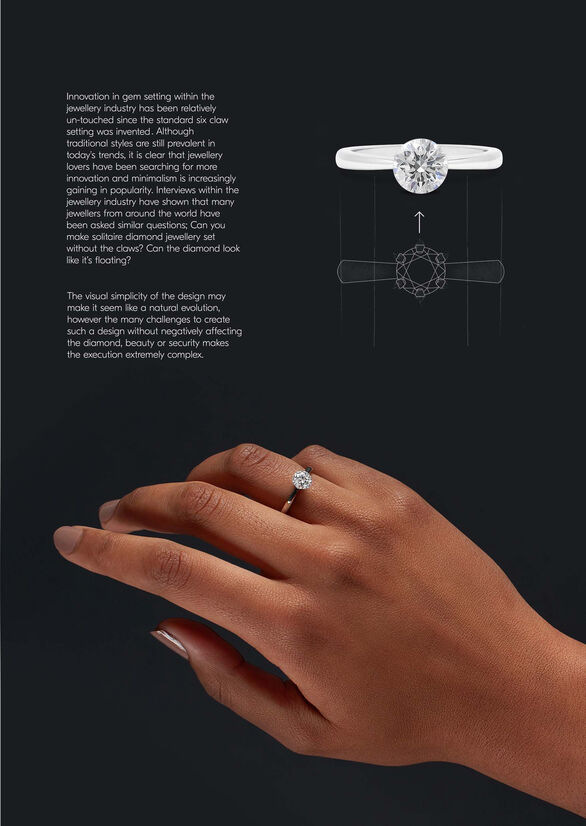 Around the world, clients have been asking "Can you make this design without claws or clasps?”. Of course, under traditional jewellery manufacturing processes, this was never possible... Until now. Current setting techniques for solitaire diamonds, require a craftsman to attach metal to the upper surface of the diamond to hold it in the setting. This results in a distraction from the purity of the diamond and a reduction in the sparkle. To hold a solitaire diamond safely and with no reduction in the “sparkle” or light return is the epitome of excellence in this field and this is now possible with our patented Floeting Diamond cut and setting process. The process required for setting does not require a traditional trained jeweller to complete which saves costs in the manufacturing process.
