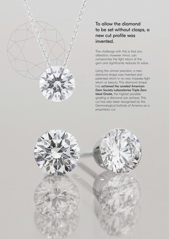The custom designed patented diamond cut allows a micro-engineered setting to be secured below the widest part of the diamond, creating a top-down view that is free of prongs or overarching metal. The elegant and minimalist design directs all attention to the diamond’s sparkle and scintillation that is maximised by this setting.