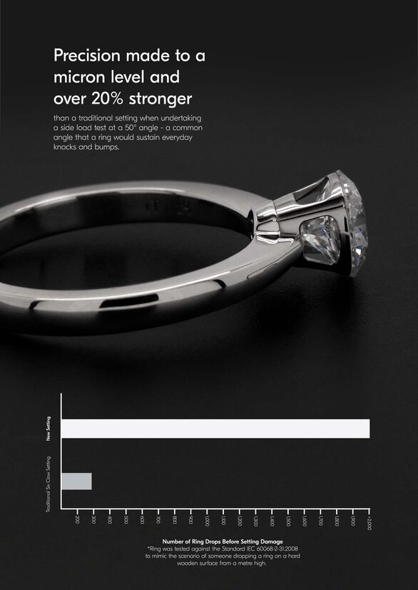 Most current gemstone settings are made from traditional precious metals, which wear down over time or are damaged through everyday wear and tear putting the diamond at risk of coming lose and needing to be replaced, often resulting in a cost to the owner and/or their insurer. To prove The Floeting Diamonds superior strength, we have conducted extensive independent testing. In a side load test undertaken at a 50° angle, The Floeting Diamond was proven to be over 20% stronger than a traditional setting which showed very early signs of deformation damage. In a side load stress test undertaken at a 90° angle, the traditional setting showed signs of extreme deformation at 77N. In comparison, The Floeting Diamond was completely unaffected at 77N and showed no signs of deformation.