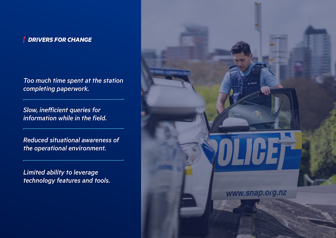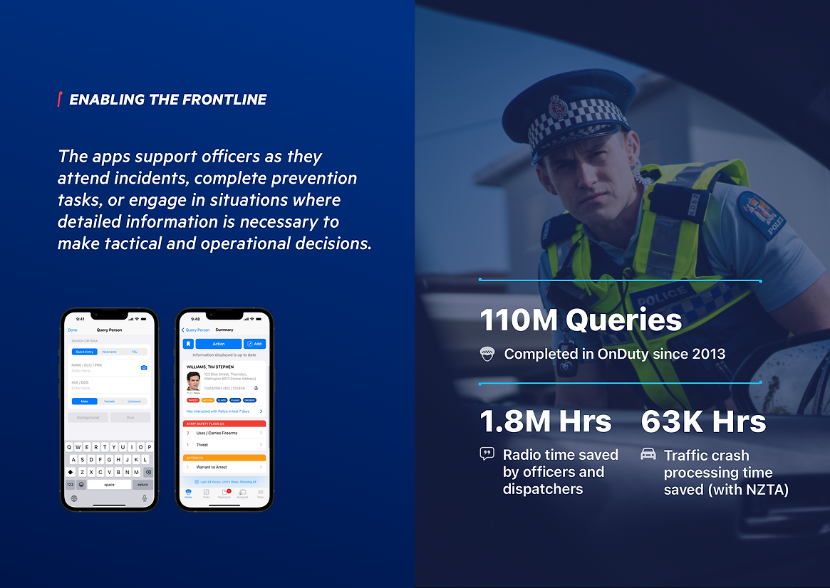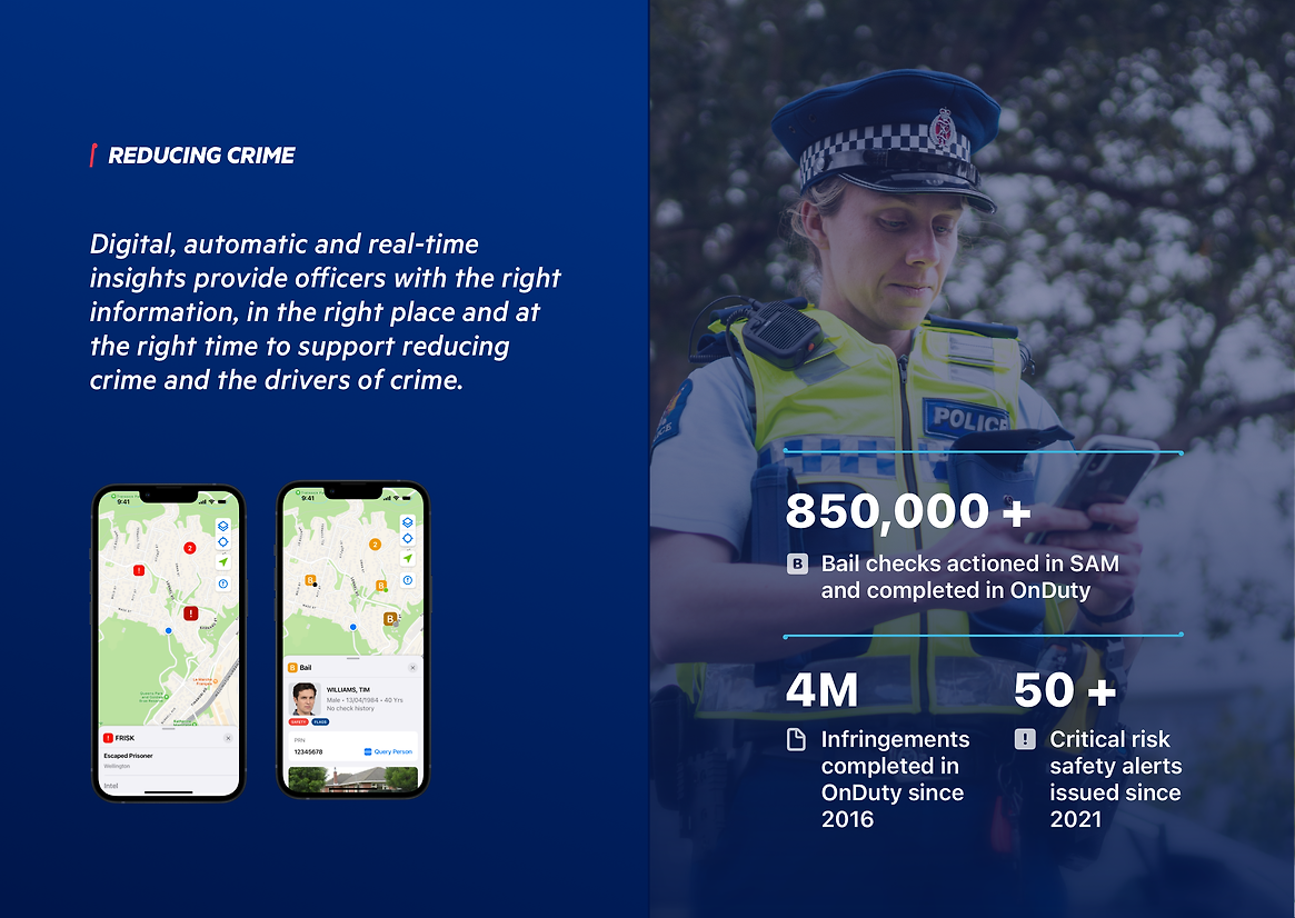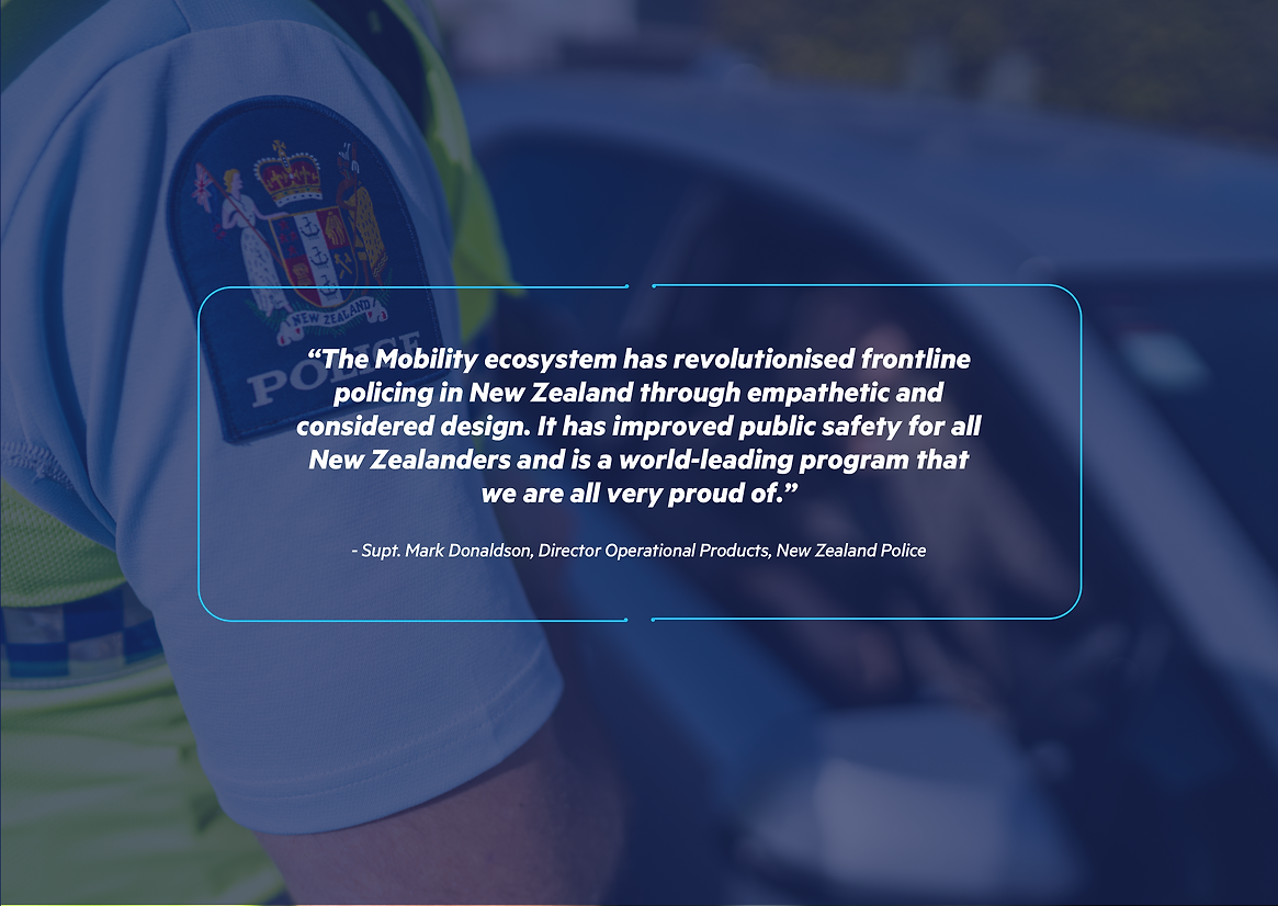 Supt Mark Donaldson summarises the overall impact: “The Mobility ecosystem has revolutionised frontline policing in New Zealand through empathetic and considered design. It has improved public safety for all New Zealanders and is a world-leading program that we’re all very proud of”.