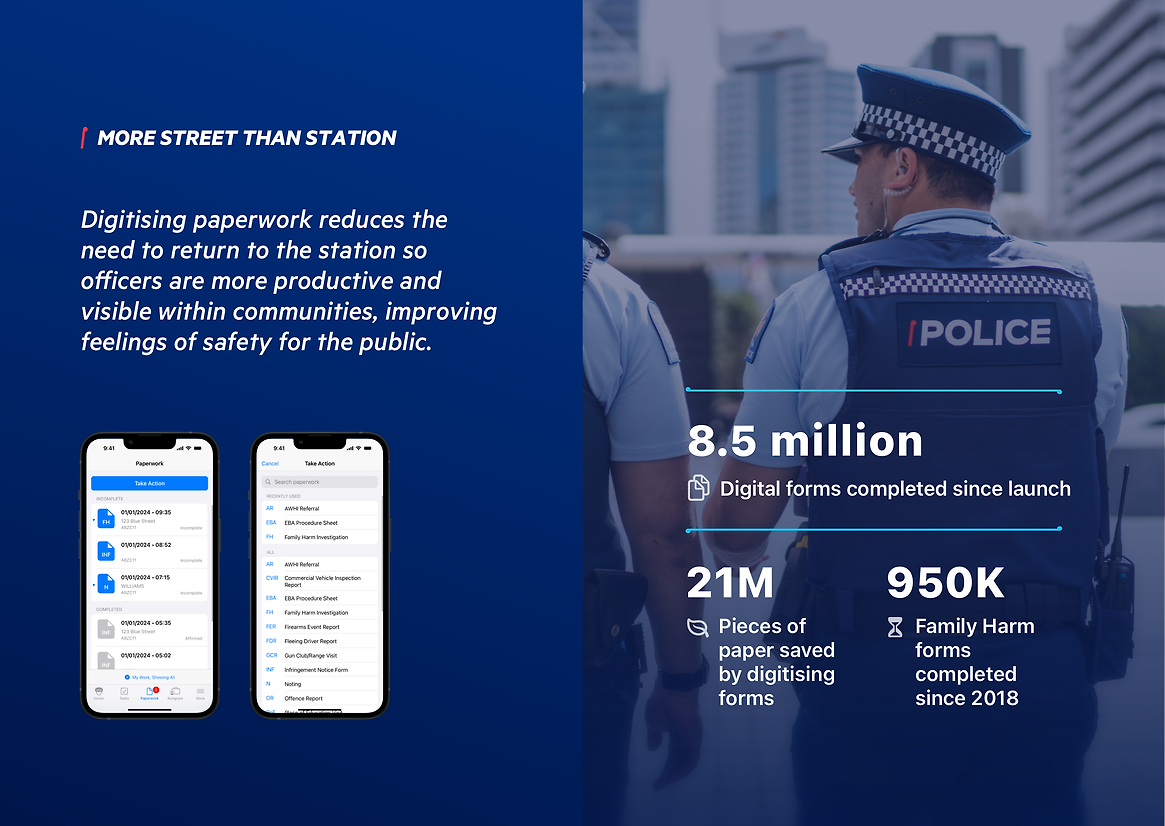 As of July 2024, we have digitised 18 paper forms in the Mobility Ecosystem, including the Family Harm form. Digitising paperwork reduces the need to return to the station, so officers are more productive and visible within communities, improving feelings of safety for the public.