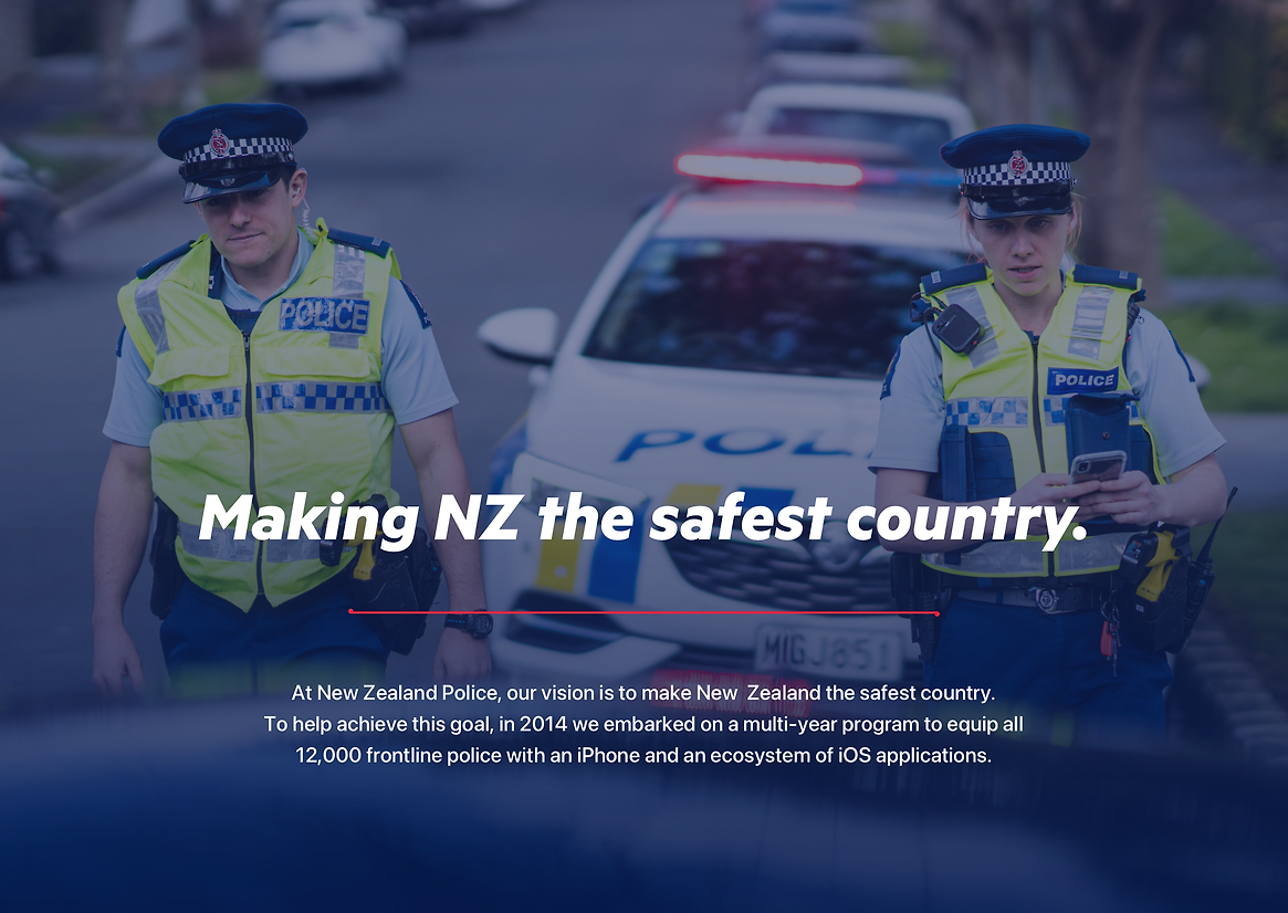 Our vision is to make New Zealand the safest country. To help achieve that goal, in 2014 we embarked on a multi-year program to equip all 12,000 frontline police with an iPhone and an ecosystem of iOS apps that have saved over 1.8 million hours of police time and more than 21 million pieces of paper. This program is known as the Mobility & Deployment Ecosystem.