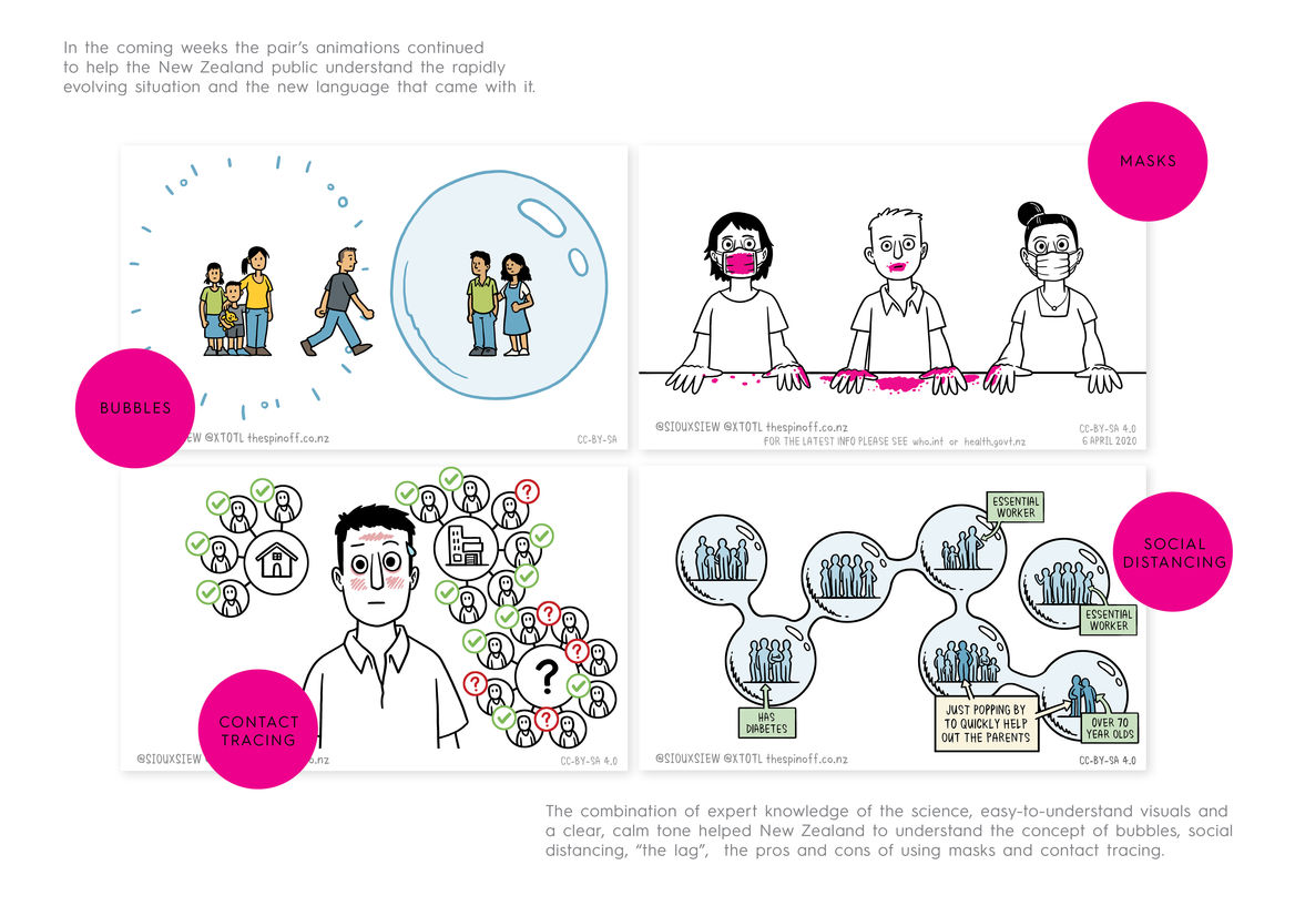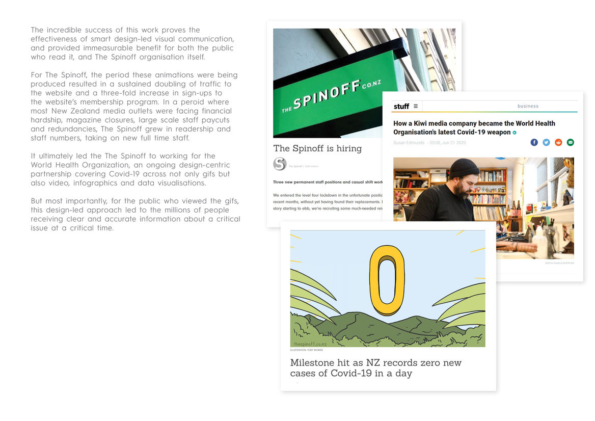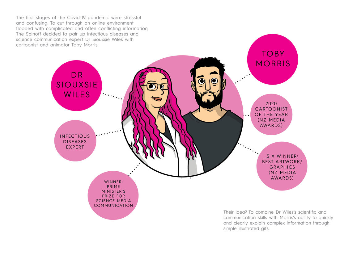 Value of Design Award Value of Design Animation Digital Film Graphic Moving Image (archived 2025) Product Social Good Award Spatial Toitanga Value of Design Award User Experience Award (archived 2019) All categories Value of Design All years 2025 2024 2023 2022 2021 2020 2019 2018 2017 2016 2015 2014 2013 2012 2011 2010 Studio A-Z The Spinoff 3 Covid 19 - Siouxsie and Toby 2020 Value of Design Credits Ngā Kaimahi / Team Members Toby Morris, Duncan Grieve, Toby Manhire Kaitautoko / Contributor Siouxsie Wiles Client The Spinoff